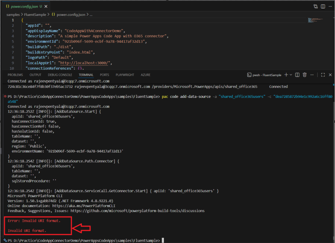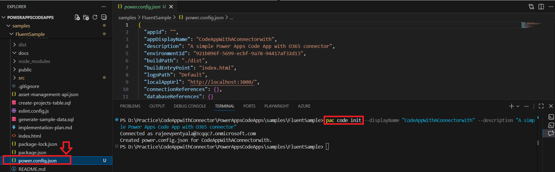 - Run pac code init to initialize the Code App project. This step generates a power.config.json file.