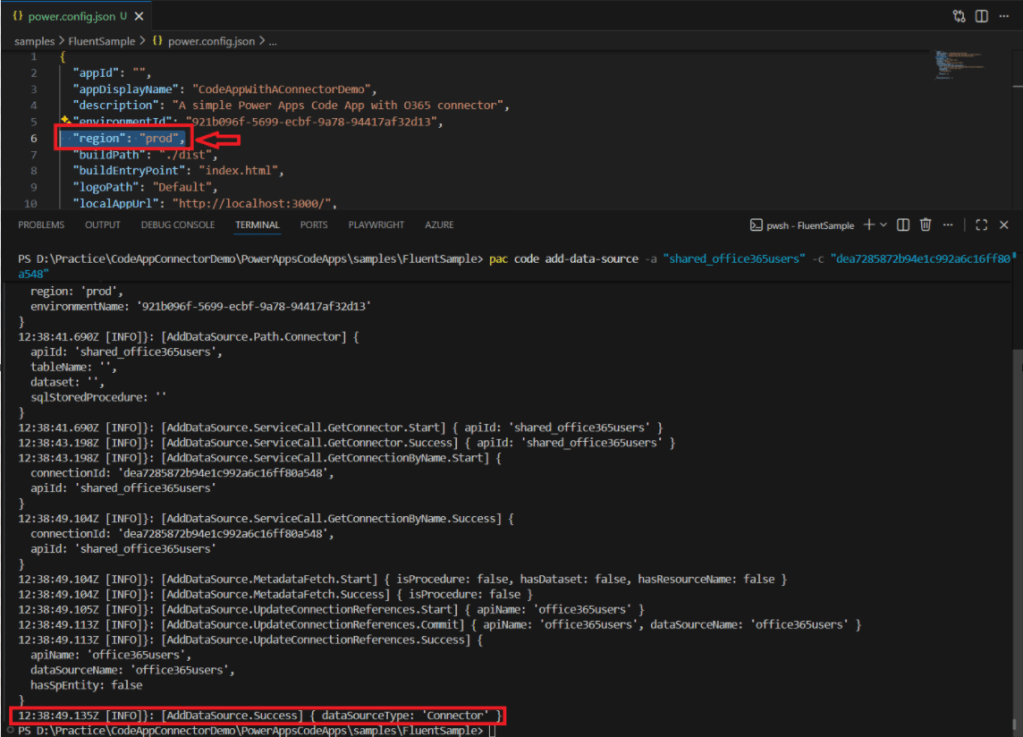 pac code add-data-sourcecommand. This time, the command executed successfully: