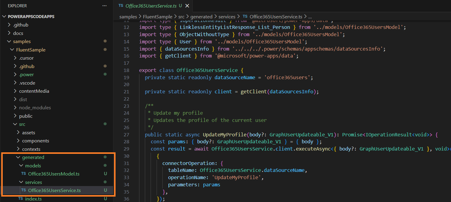 - pac code add-data-source command generated Office365UsersModel.ts and Office365UsersService.ts files as shown below.