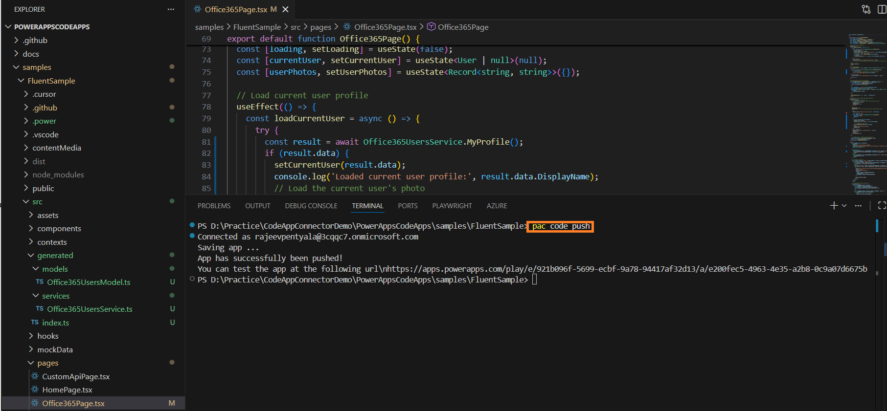 - Run the pac code push command to push the Code App to your Power Platform environment.