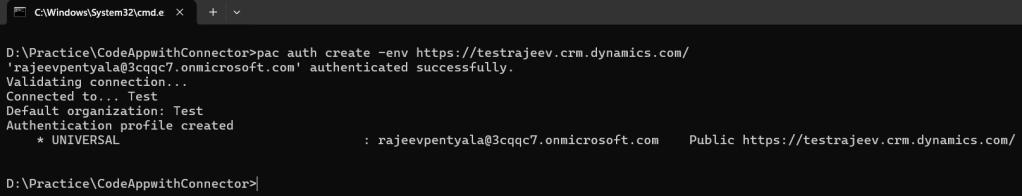- Run the pac auth create command to create an authentication profile. This command sets up a connection to the Power Platform environment where you’ll be deploying the Code App.