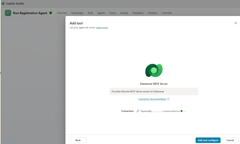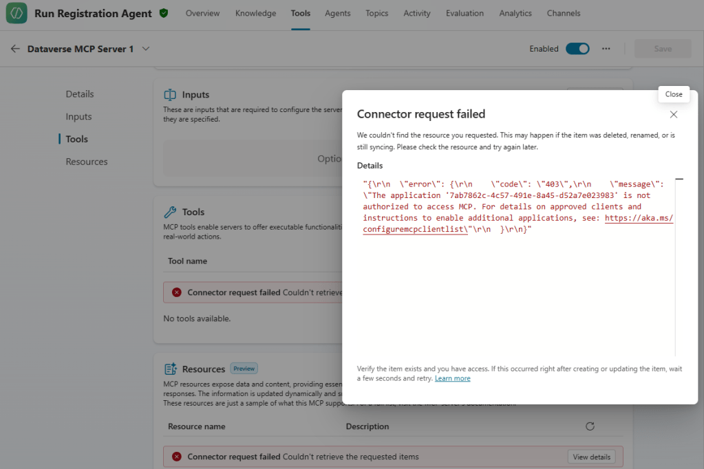 - After this is configured, go to Copilot Studio and try to add the Dataverse MCP Server from the Tools section to an agent. In the configuration page you will notice Connector request failed error is displayed, as shown below.