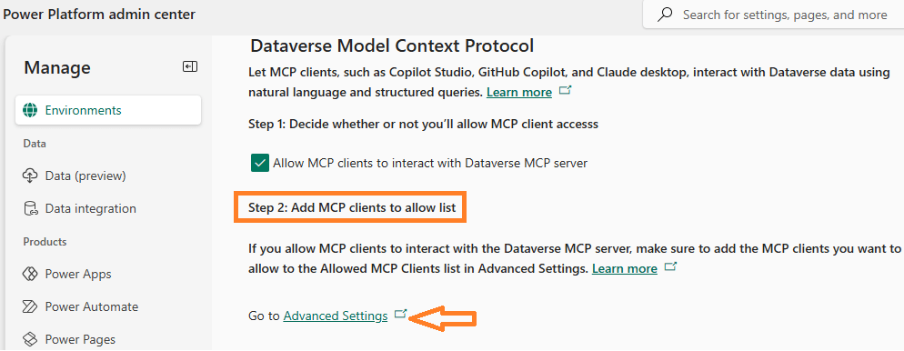 - Scroll down to locate Dataverse Model Context Protocol section.