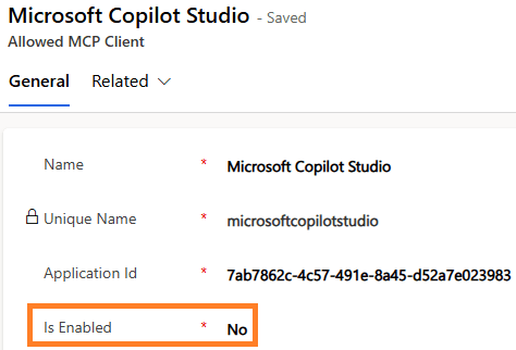 - Select Microsoft Copilot Studio record under the Allowed MCP Client table and set Is Enabled as No.