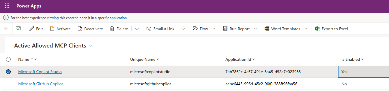 - Select Microsoft Copilot Studio record under the Allowed MCP Client table and set Is Enabled as No.