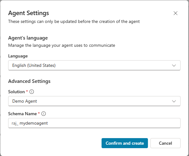 This is a very useful option because these settings (Language, Solution, and Schema Name) can only be defined before the agent is created and cannot be changed afterward.