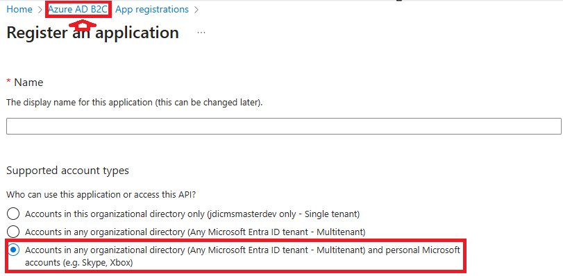 Make sure that you create the App Registration under Azure AD B2C (not Azure Active Directory) and select the correct option under Supported account types, as shown below.
