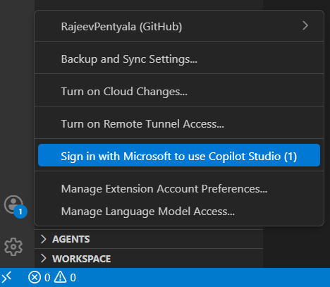 - In the VS Code, click on the Accounts icon in the bottom left corner and click Sign in…Copilot Studio, as shown below.