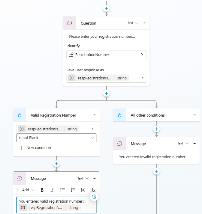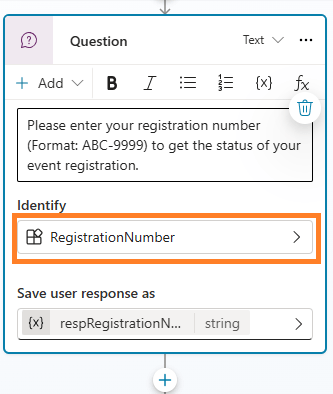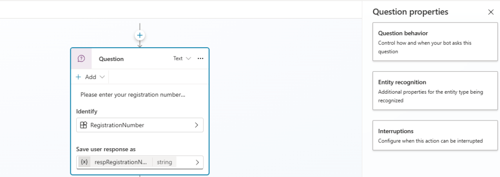 - Next, we will be using Question to ask the user to provide Registration Number and capture the user response using the RegistrationNumber RegEx entity. This is exactly what the slot filling concept is.