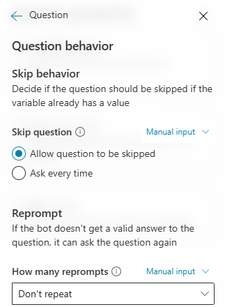 - Choose Question behavior and set How many reprompts to Don’t repeat