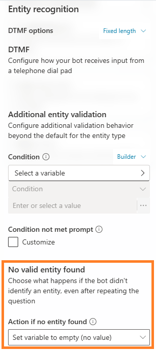 - Next, choose Entity recognition and set Action if no entity found as Set variable to empty (no value)