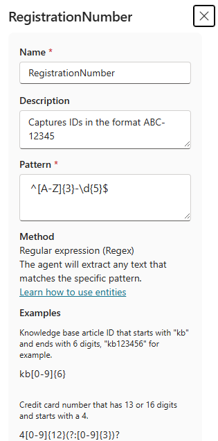 - In the panel that opens, enter a name for your new entity. Enter the regular expression pattern that should be used to match and extract entity items from the input.