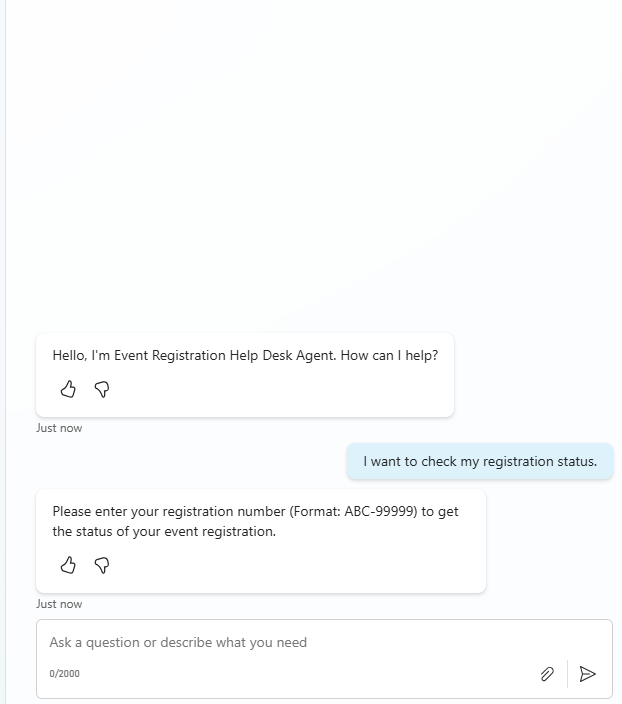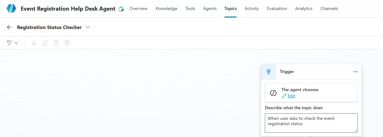- Create a new Topic named Registration Status Checker with Trigger as The agent chooses