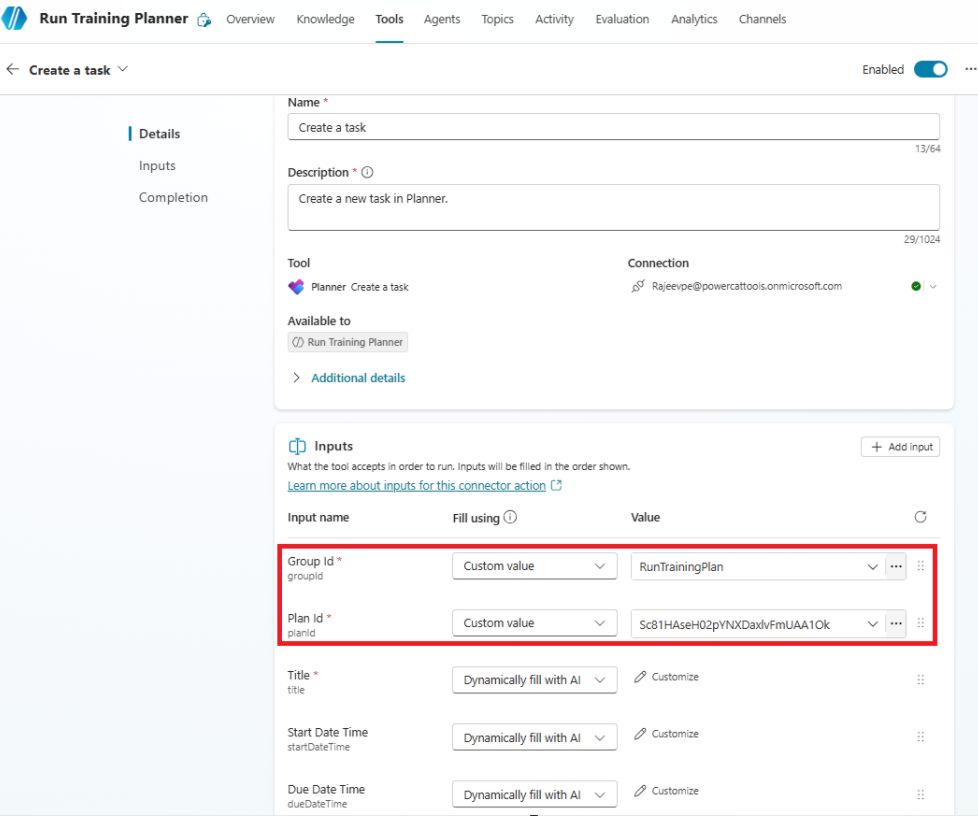 One important thing to note is that Copilot Studio’s Planner tools require a Plan Id and a Group Id.