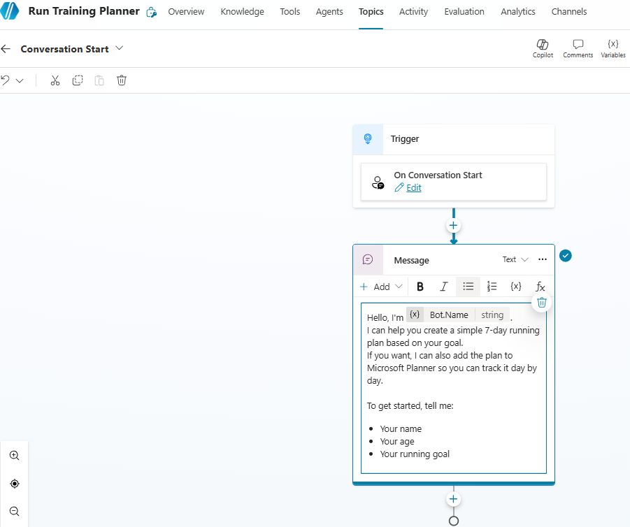 Update the Conversation Start topic to replace the generic greeting with a message that matches this scenario. This helps guide the user and sets clear expectations from the start.