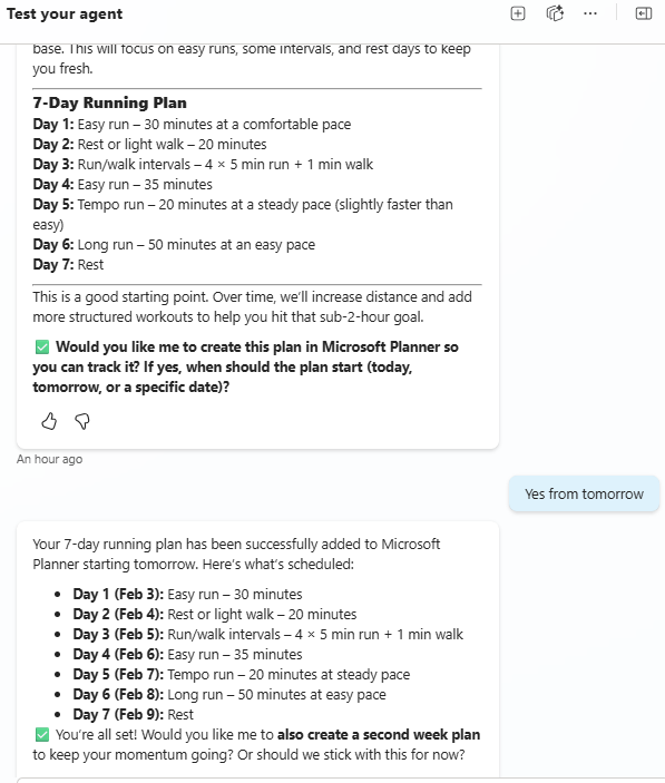 - The agent generates a 7-day training plan. Agent asks whether to create tasks in Planner and for a start date. Respond with Yes and choose a start date (for example, tomorrow).
