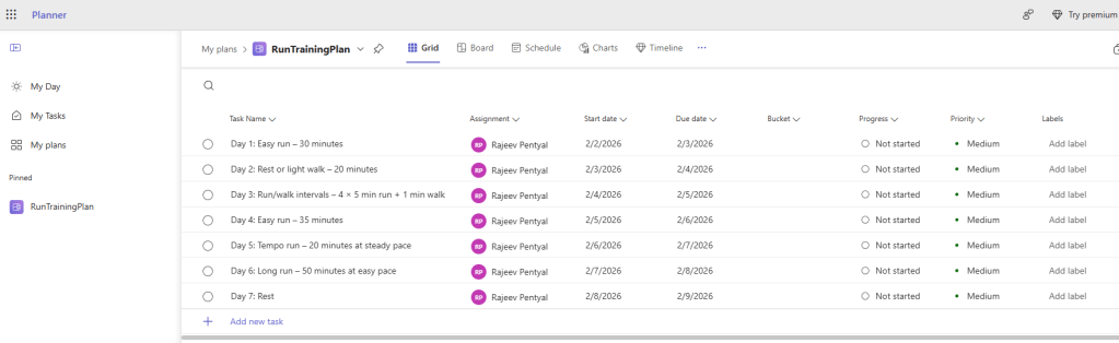 A weekly running plan is already a list of tasks — one task per day. By adding those tasks to Planner: