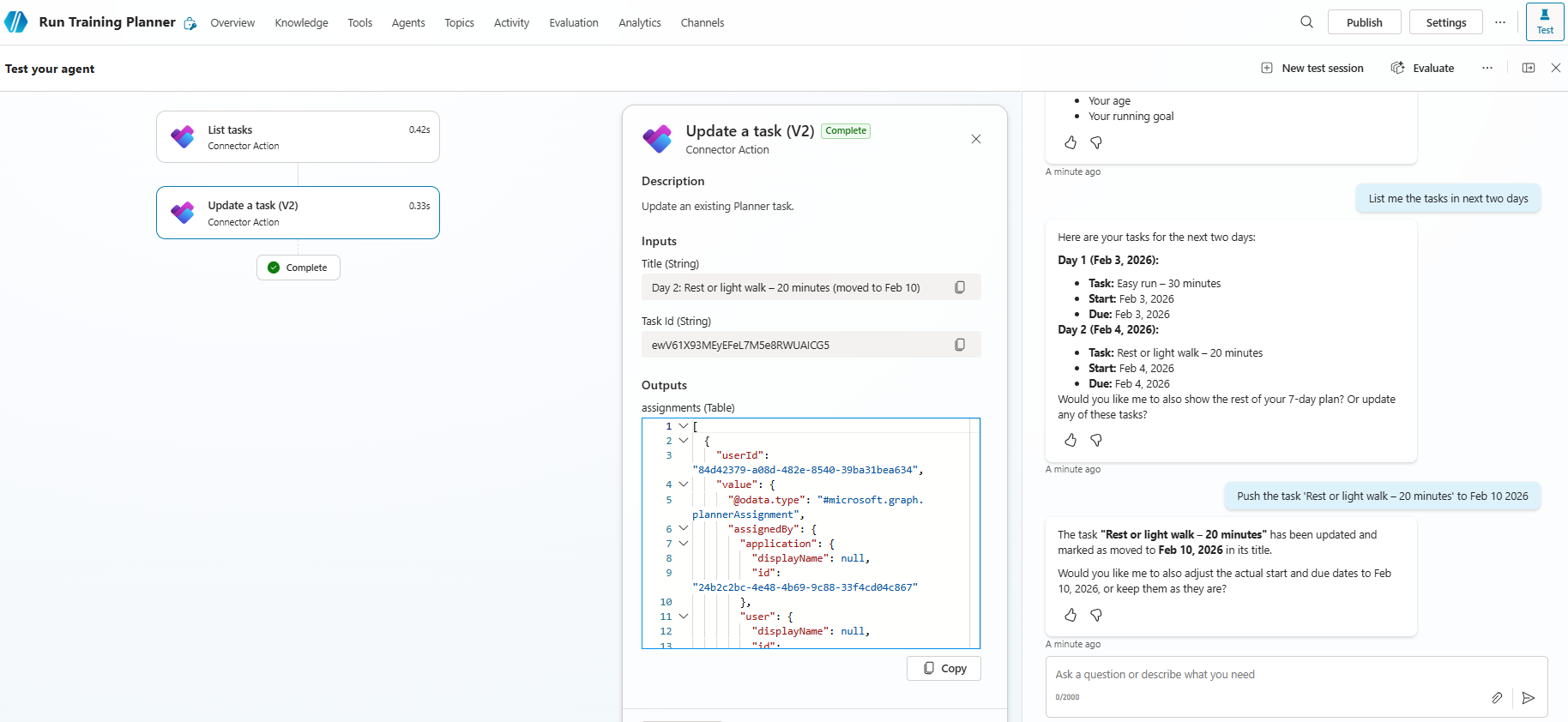 In this example, most of the requirements — asking the right questions, generating a 7-day plan, and using Microsoft Planner only when requested — are achieved through clear and well-structured instructions.