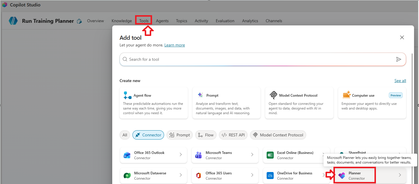 Since tasks must be created in a specific plan (RunTrainingPlan), additional configuration is required for the Planner tools like Create a task and List tasks.