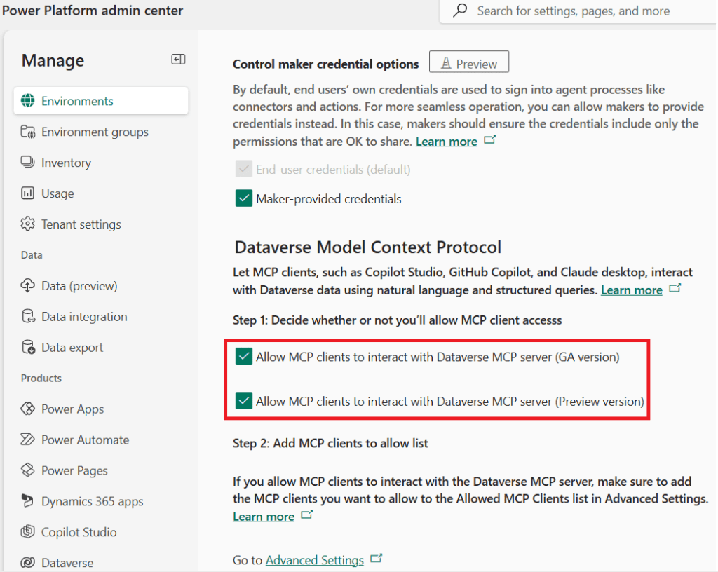 - More information: Configure and manage the Dataverse MCP server for an environment