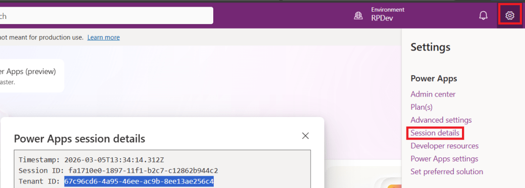 - Copy the value of the Tenant ID from the Power Apps session details