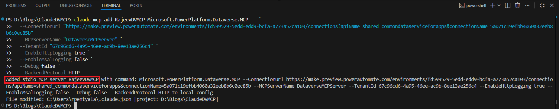 claude mcp add RajeevDVMCP Microsoft.PowerPlatform.Dataverse.MCP -- ` --ConnectionUrl "https://make.preview.powerautomate.com/environments/fd599529-5edd-edd9-bcfa-a773a52ca103/connections?apiName=shared_commondataserviceforapps&connectionName=5a071c19efbb4060a32eeb8b6c0ec85b" ` --MCPServerName "DataverseMCPServer" ` --TenantId "67c96cd6-4a95-46ee-ac9b-8ee13ae256c4" ` --EnableHttpLogging true ` --EnableMsalLogging false ` --Debug false ` --BackendProtocol HTTP