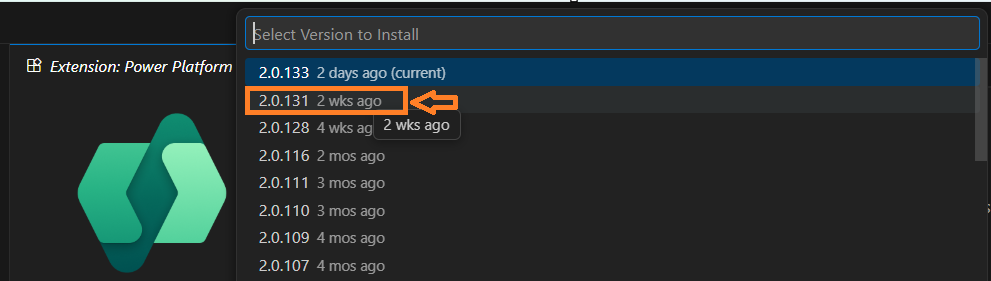 - Select the previous version, which is 2.0.131 in this case.