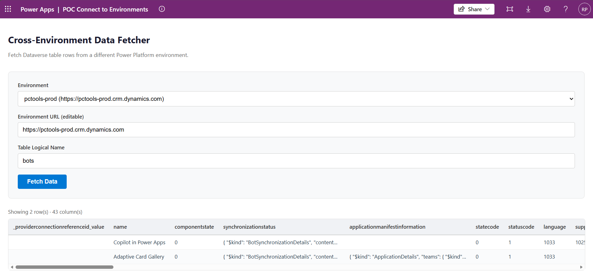 In this article, we explored a Power Apps Code App that queries Dataverse tables across different Power Platform environments — using a Microsoft Dataverse connector.