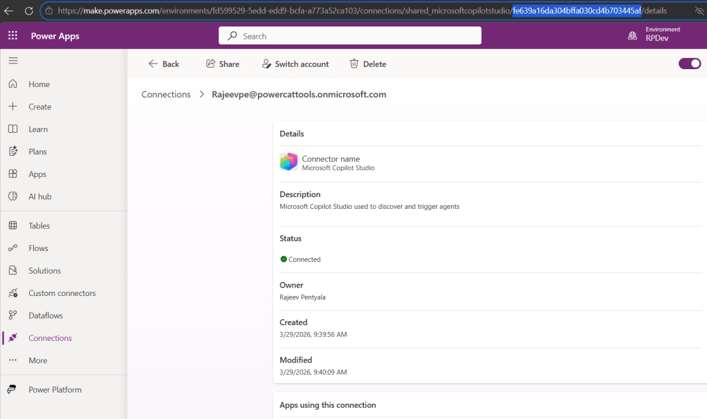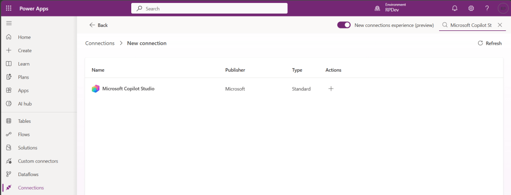 - Set up a new connection for the Microsoft Copilot Studio connector in your Power Platform environment.
