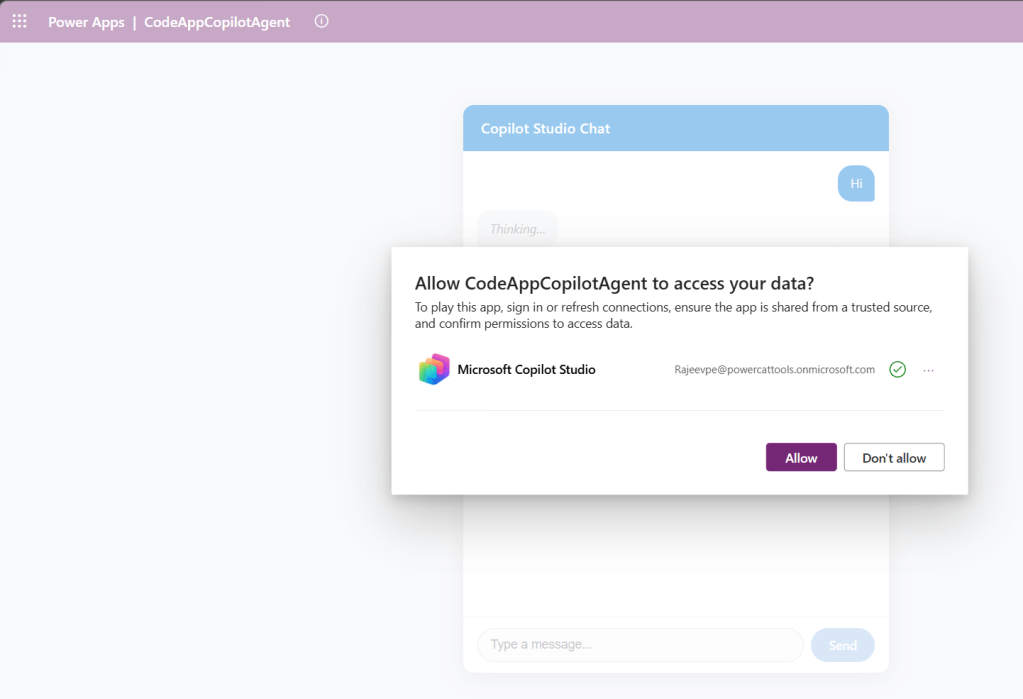 - Open the Code App and click Allow to authorize the Microsoft Copilot Studio connector.