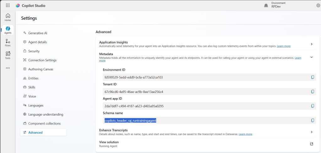 - Open the agent. Go to Settings > Advanced > Metadata and copy the Schema name