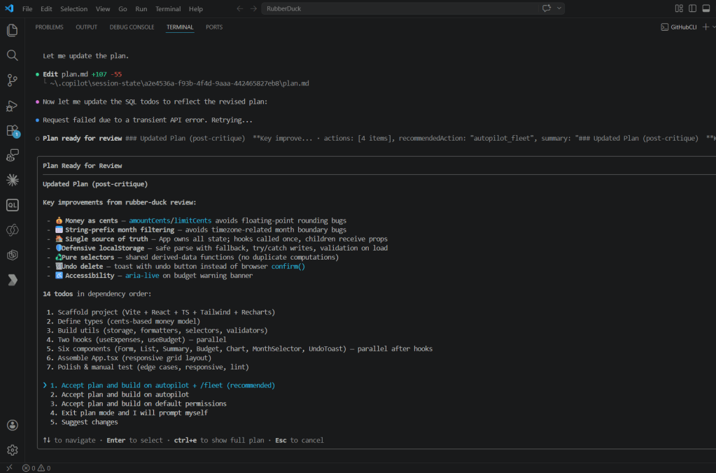 - Once Rubber Duck completed the review, Copilot absorbed the findings and produced an Updated Plan (post-critique) — clearly listing every key improvement made as a direct result of the review.