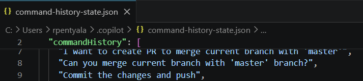 Open the file and you’ll see a commandHistory array — a list of every prompt you’ve typed into Copilot CLI.